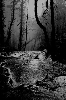 4.This picture seams to be taken at nightfall in the middle of a forest with a raging river flowing through it. It looks like it might be misty or foggy which kind of creates question. Like whats going on behind the trees, off in the distance? I see lots of almost dead, werid, awkward trees. They almost look like they're going to fall over.